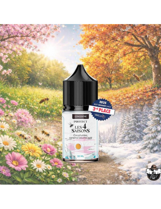 Das Konzentrat Cacahuètes Caramel Beurre Salé aus der Reihe Les 4 Saisons - Hiver von Protect ist ein Aromakonzentrat für die DIY-Zubereitung im 30-ml-Flakon. Es vereint die offiziellen Aromen Erdnüsse, Karamell und gesalzene Butter. Die empfohlene Dosierung liegt zwischen 20 und 24 %, bei einer Reifezeit von drei Wochen. Dieses Produkt muss in einer Basis verdünnt werden und ist nicht zum alleinigen Dampfen geeignet.